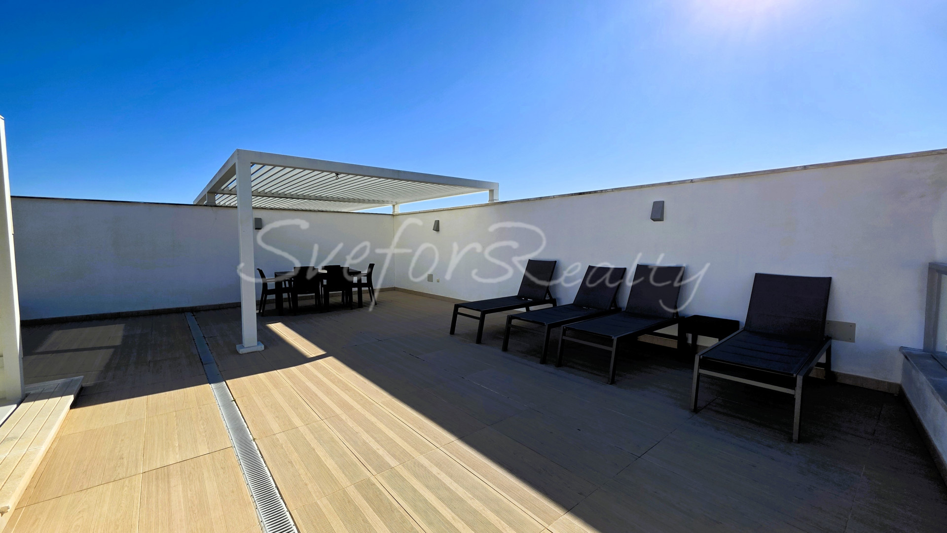 The penthouse offers 3 bedrooms and 2 bathrooms, the multifunctional kitchen is fully fitted, the terrace is perfect for outdoor dining and if you prefer you can access the fabulous solarium where one can enjoy sunbathing and/or entertaining.